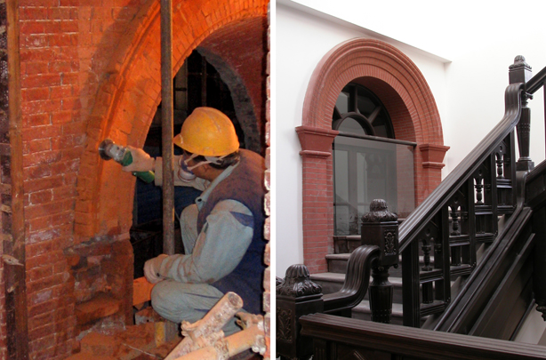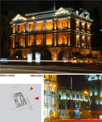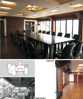 整修和复原主要包括,去除外立面柱间的后加钢框玻璃窗,拆除柱廊间后加的隔墙,完全恢复历史上敞开的柱廊;以分块切割、剔除的方法去掉外墙表面的水泥砂浆,修复清水红砖墙;再现东立面竖三段构图,复原其南北两端的山花屋面;按原样加固、修复木制楼梯;重点修复各层休息平台处的红砖券窗;修复原楼梯楼,在梯井顶部增加采光玻璃顶。利用恢复的坡屋顶内部增加一层会议、接待空间。先后获上海市优秀工程勘察设计二等奖、全国优秀工程勘察设计三等奖。