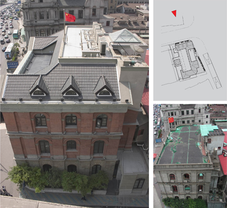 外滩九号“轮船招商总局大楼”建于1901年,是在原旗昌洋行(Russell&Co.,1870年代起陆续被清政府招商局收购,今福州路17号为其遗存)临江花园的基址上建造的。这栋楼房是外滩建筑群中唯一一座保留下来的英国维多利亚时代后期新古典主义风格的外廊式建筑,也是“洋务运动”后对中国最具象征性和纪念意义的建筑物之一。百年沧桑,物是形非,几十年来建筑南北两翼的山花及整个坡顶屋面被拆除,新古典柱式构成的敞廊被简陋厂房般的玻璃面钢窗封死,红砖墙被水泥砂浆抹平,室内则由各时期的吊顶、夹层、搭建所充斥,除木楼梯及一些券门、券窗外,已难辨识昔日模样。