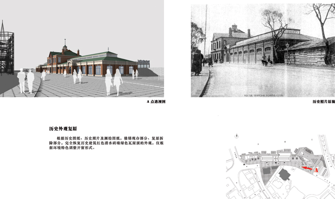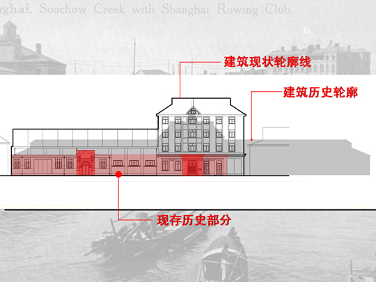 划船俱乐部是中国近代史上保留下来最早、也是上海现存最早的体育建筑之一,属上海二十世纪初苏州河滨水休闲建筑的代表性类型。百年来这一建筑与沪上划船、游泳活动等相关联,成为历史记忆的载体和地区文化认同的重要载体。2004年接受设计委托时,现状已面目全非,但中部会所和西翼游泳池的主体结构空间格局和入口雕饰的细节仍较完整地保留下来,因而存在着外观恢复和内部空间再利用的可能。