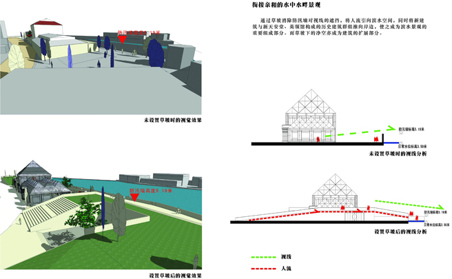 采光的玻璃屋顶将室外景观引入室内,通过草坡消除防汛墙对视线的遮挡,将人流引向滨水空间,同时将新建筑与新天安堂、英领馆构成的历史建筑组群展开于苏州河畔。