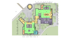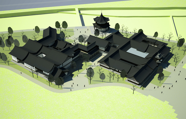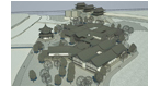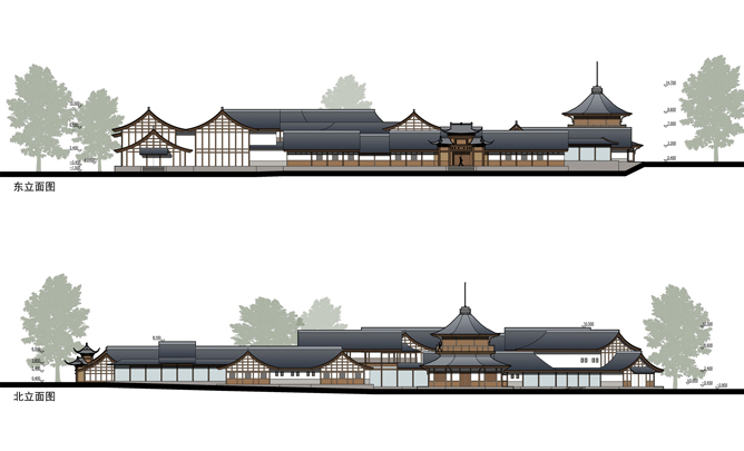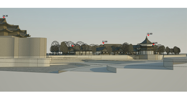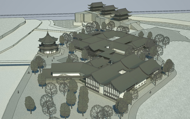 本方案设计通过适当减小建筑密度和体量,优化建筑平面,调整各部分面积比例,从而改善了原有建筑群的功能;实现了整体景观质量的提升:1、将陈列馆体量收缩,在东西两端大幅后退,西侧避让基地内现有高大乔木,东侧拉开与伏龙观的距离,以减小对其影响;2、通过对主体建筑的限高(12米),以及原水闸建筑的改造,既保持了原建筑群天际线的相对稳定不变,又将其制高点移至水畔,大大改善了临水景观;3、复建的建筑群采用川西风土民居风格,与伏龙观风貌整体协调,但保持一定的差异性,以形成明确的主从关系。