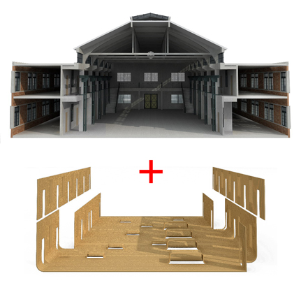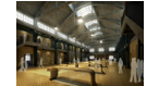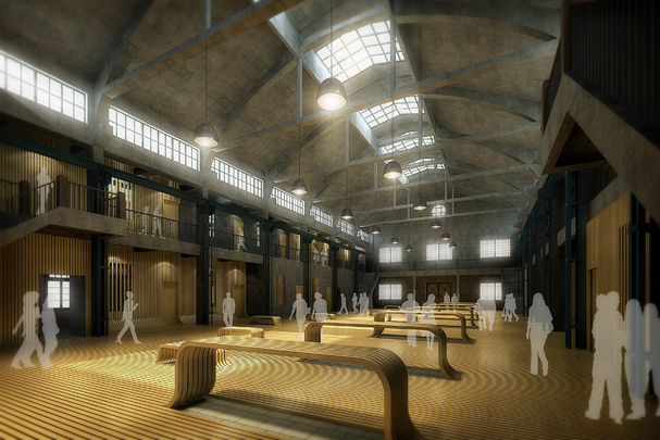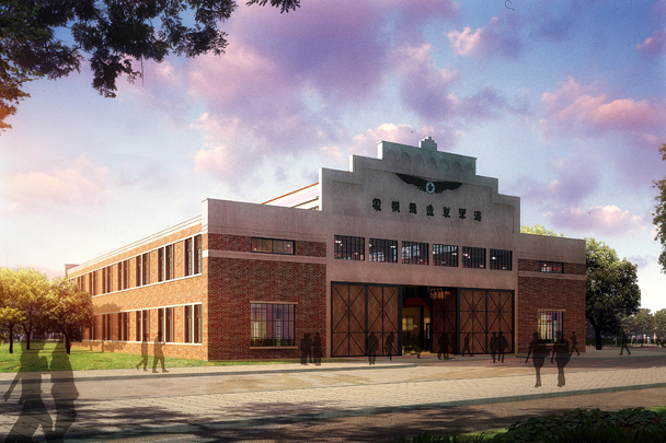 江南造船厂飞机库是是中国历史上第一家飞机制造工厂——海军制造飞机处在1931年迁往上海后的飞机制造车间。简洁而具纪念性的建筑南立面上,原有民国海军军徽以及“海军飞机制造处”7个大字痕迹尚存。通过对历史照片和现场研判,将立面的形制复原到原初状态,以强调其历史纪念性。飞机库室内的特色在于大尺度空间、钢筋混凝土结构的粗犷厚重,以及历久的沧桑感。因而采取的再生策略是:保持历史空间特征基础上;新“叠加”上去的元素采取了以温暖、小尺度、纤细、弯折的木质元素以与冷峻粗犷的钢筋混凝土相映成趣。
