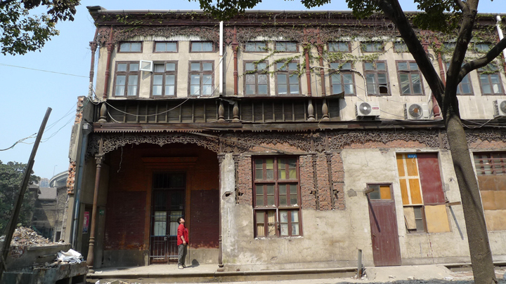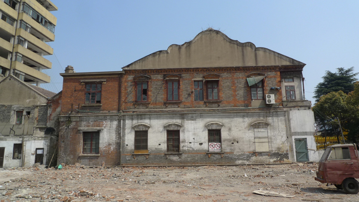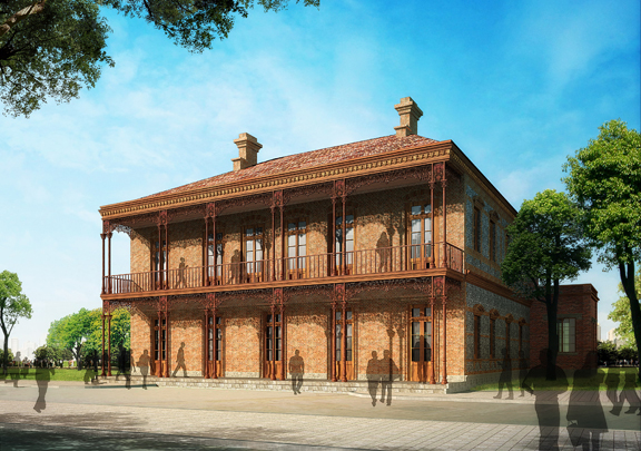 该栋建筑建于1923年,是求新船厂的“法国大班”办公楼,立面颇具维多利亚时代特征,清水砖墙砌就的建筑立面有着精美的巴洛克窗饰和线脚,南立面的铸铁外廊由科林斯柱式和植物纹样的挂落组成,在上海的近代建筑中甚为罕见。但现状被搭建和植物覆盖的立面、明显被改造过的屋顶、被严重改变的平面形制和入口,严重损害了观者对建筑的认知。