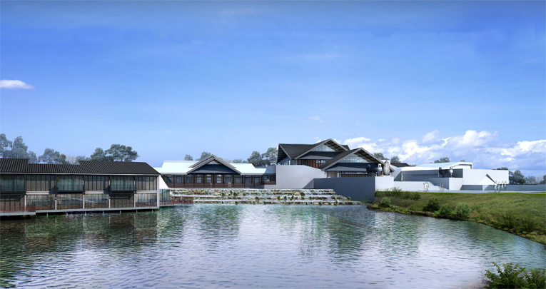 体验建筑群(博物馆部分)采用山地建筑灵活多变的空间布局,保留均衡有序,主次分明的传统建筑古韵。主要建筑均为现代钢结构,深灰色的结构构件与朱红色的装饰构件相映生辉,从而以现代方式,传达了《楚辞》中对建筑这两部分“玄”、“朱”着色的历史信息。主体建筑楚乐厅的钢结构十字脊悬山顶、钢-玻璃山披,两翼研习空间和餐饮空间的叠套式悬山顶等造型,与斜龛高窗的现代空间实体相互穿插、交融,以及骚坛上古鼎的点缀对比等,均是“古韵新风”设计理念和手法的重点体现。