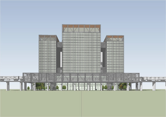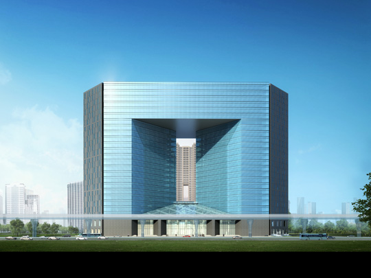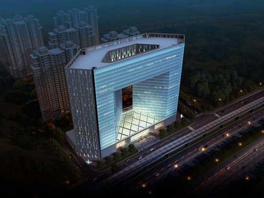 基地位于郑州东部郑开大道南侧,地处郑汴产业园白沙组团,西距郑东新区CBD中心9公里。大厦占地面积1.5公顷,建筑面积约10万平方米,地面25层,地下三层,结构限高100米以下,南面距轻轨线仅50米。设计以“建设之门、都市之夢”的理念,构思了一个菱形的大门形象,门洞上部连接体为管理办公空间,左右两个楼体为企业办公空间,裙房为公共服务空间。屋顶有开放的大型下沉式绿化庭院。建筑整体造型雄健厚重,虚实对比强烈,底层入口巨大的斜坡屋面中庭透出大气磅礴的汉魏遗风。