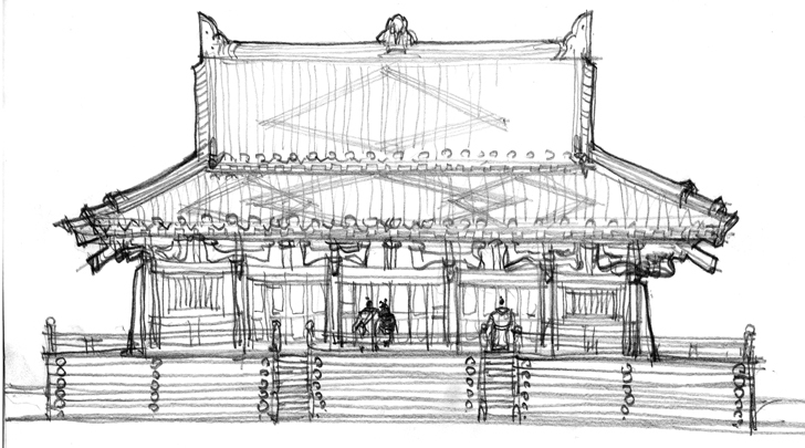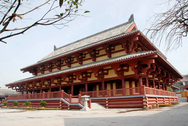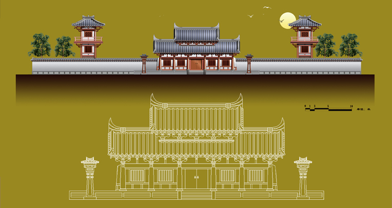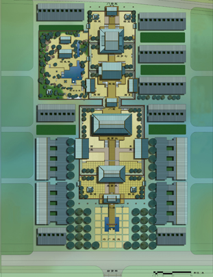 史载曹操于建安年间迎汉献帝于许昌,进位丞相,挟天子以令诸侯,加九锡,封魏王。在其故地建曹操纪念馆是具历史文化意义的。方案设计采用前朝后寝的总体布局。馆外广场建有颍川群贤坊、萧墙,馆门前设东西双阙,门内前院两侧各有望楼一座。中轴线上,前朝的求贤堂、议事堂、东西堂,后寝的寝门、寝殿、东西厢、七步阁、后府门依次排开,整座建筑群均按汉魏制度坐落在1.8-4.5米的井干高台上,其中由议事堂至七步阁的纵列核心建筑共同坐落在中央井干台上。建筑形式参照汉画像砖等图文资料,在比例尺度上予以细致的控制和推敲,并采用曲栾、直屋面等以凸显汉魏时的建筑风尚。