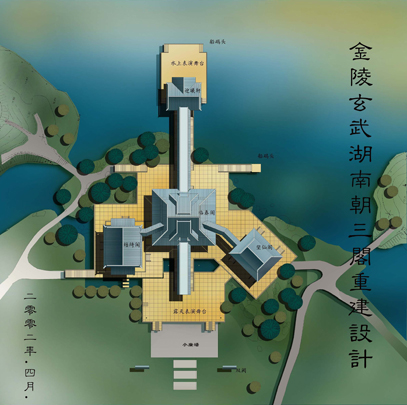 据《南书》记载,三阁曾建于燕寝光昭殿前,依制应为品字布局,不至严整对称,却也尊卑有别。故方案设计以临春阁居中高耸,结绮、望仙二阁戚戚相依,在尺度、体量、高度及姿态上表现出主次分明的空间关系。在风格取向上,考虑到晋室南渡以来,华夏正统便迁移建康,而三阁初建时代,已是南朝尾声,因而建筑风格应上承下继,取汉晋之余韵,采隋唐之遗风。故有悬山披檐、曲拱井干、复道行空、东西阶级.......。三阁屋顶均采用歇山早期特征,即悬山加侧披的古朴作法;屋顶及平座下用汉魏以来的井干壁承托上部结构,再配以斗子蜀柱、曲臂拱、人字拱等早期细部特征;积石为山,引水为涧,并穿井干层台而过,取意招凉水殿;向湖面伸出水榭,以强化亲水楼台意象。