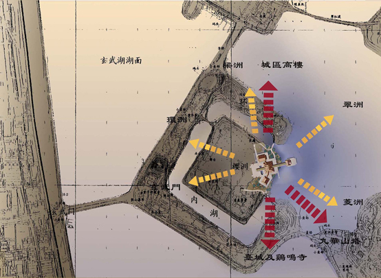 方案设计基地位于江苏省南京市东北、玄武湖中的樱洲东部,东、北两面临湖。樱洲除与玄武湖其它数洲保持较近距离的视线交流外,可北眺南京市区起伏跌宕的林立高楼,西眺玄武湖畔蜿蜒的明城墙及玄武门,西南眺台城、鸡鸣寺,东南眺望清隽的九华山(覆舟山),山巅的玄奘大师顶骨塔以及绵延的紫金山。