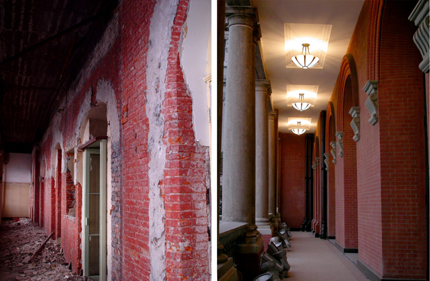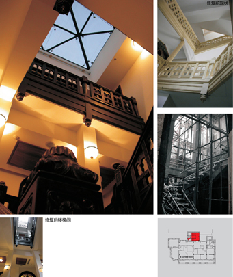 整修和复原主要包括,去除外立面柱间的后加钢框玻璃窗,拆除柱廊间后加的隔墙,完全恢复历史上敞开的柱廊;以分块切割、剔除的方法去掉外墙表面的水泥砂浆,修复清水红砖墙;再现东立面竖三段构图,复原其南北两端的山花屋面;按原样加固、修复木制楼梯;重点修复各层休息平台处的红砖券窗;修复原楼梯楼,在梯井顶部增加采光玻璃顶。利用恢复的坡屋顶内部增加一层会议、接待空间。先后获上海市优秀工程勘察设计二等奖、全国优秀工程勘察设计三等奖。