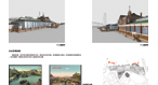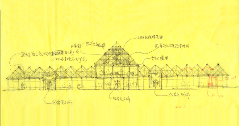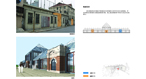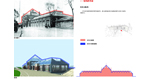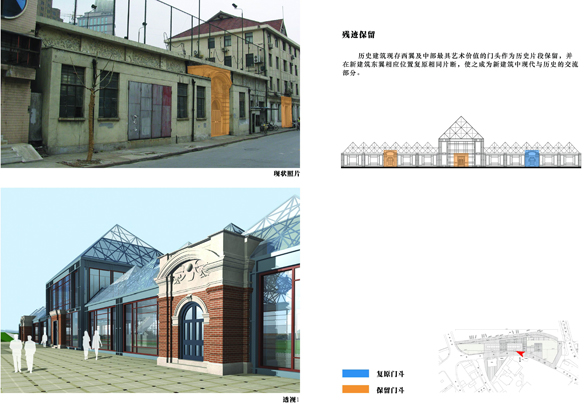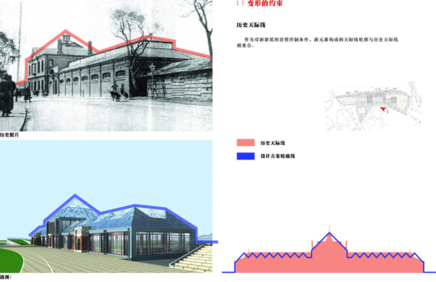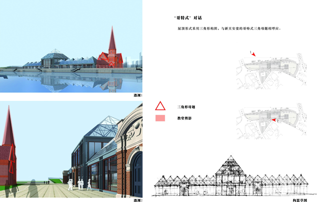 方案一为历史外观复原,根据历史图纸、照片及测绘图纸,修缮现存部分、复原拆除部分,完全恢复历史建筑红色清水砖墙绿色瓦屋顶的外观,仅根据环境特色调整开窗形式。建筑东翼充分利用室内净高,对空间进行竖向分割,使屋顶内部成为可自由分隔的大空间,而屋顶天窗的存在既解决了采光问题,亦为该部分空间增色不少。方案二重塑历史天际线,作为对新建筑的首要控制条件,新元素构成的折线形天际线轮廓与平直线形的历史天际线相重合,以纯净的玻璃方锥体的屋顶形式,与新天安堂的哥特式三角母题相呼应,既形成历史街廓,又为滨水景观增加了空间层次。将现存西翼及中部最具艺术价值的门头作为历史片段保留,并在新建筑东翼相应位置复原相同片段,使之成为新建筑中现代与历史的交流部分。