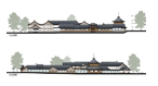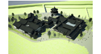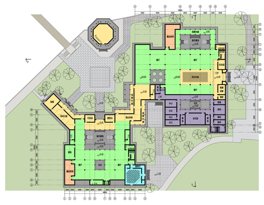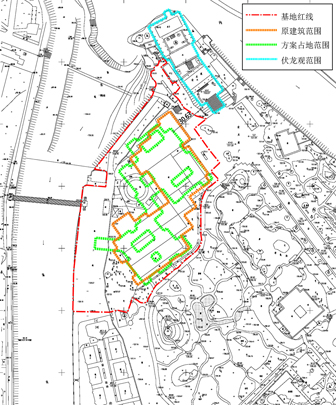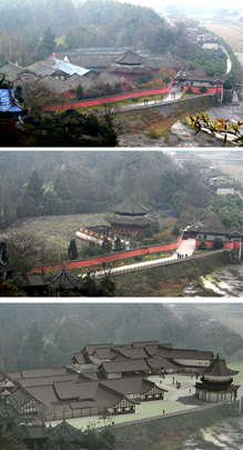 本方案设计通过适当减小建筑密度和体量,优化建筑平面,调整各部分面积比例,从而改善了原有建筑群的功能;实现了整体景观质量的提升:1、将陈列馆体量收缩,在东西两端大幅后退,西侧避让基地内现有高大乔木,东侧拉开与伏龙观的距离,以减小对其影响;2、通过对主体建筑的限高(12米),以及原水闸建筑的改造,既保持了原建筑群天际线的相对稳定不变,又将其制高点移至水畔,大大改善了临水景观;3、复建的建筑群采用川西风土民居风格,与伏龙观风貌整体协调,但保持一定的差异性,以形成明确的主从关系。