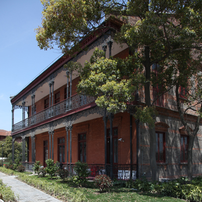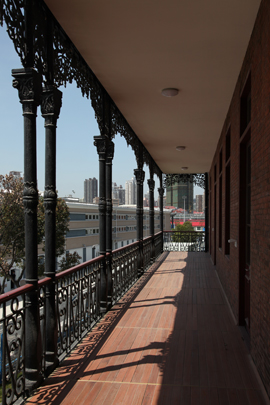 该栋建筑建于1923年,是求新船厂的“法国大班”办公楼,立面颇具维多利亚时代特征,清水砖墙砌就的建筑立面有着精美的巴洛克窗饰和线脚,南立面的铸铁外廊由科林斯柱式和植物纹样的挂落组成,在上海的近代建筑中甚为罕见。但现状被搭建和植物覆盖的立面、明显被改造过的屋顶、被严重改变的平面形制和入口,严重损害了观者对建筑的认知。