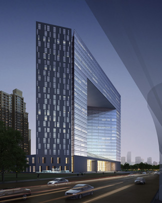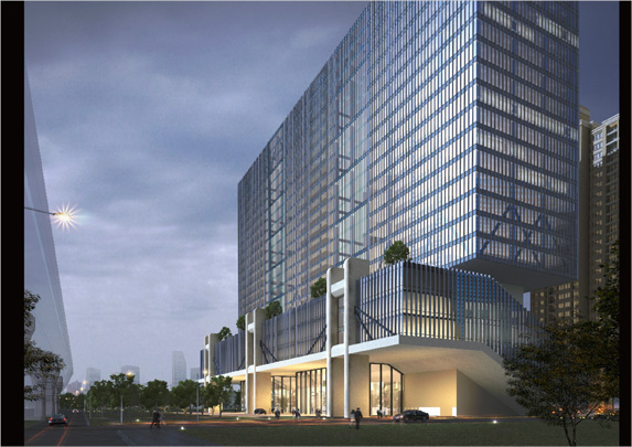 基地位于郑州东部郑开大道南侧,地处郑汴产业园白沙组团,西距郑东新区CBD中心9公里。大厦占地面积1.5公顷,建筑面积约10万平方米,地面25层,地下三层,结构限高100米以下,南面距轻轨线仅50米。设计以“建设之门、都市之夢”的理念,构思了一个菱形的大门形象,门洞上部连接体为管理办公空间,左右两个楼体为企业办公空间,裙房为公共服务空间。屋顶有开放的大型下沉式绿化庭院。建筑整体造型雄健厚重,虚实对比强烈,底层入口巨大的斜坡屋面中庭透出大气磅礴的汉魏遗风。
