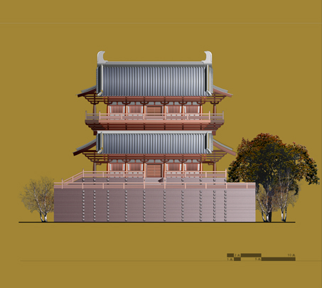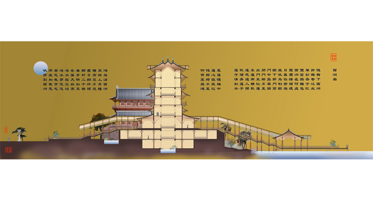 据《南书》记载,三阁曾建于燕寝光昭殿前,依制应为品字布局,不至严整对称,却也尊卑有别。故方案设计以临春阁居中高耸,结绮、望仙二阁戚戚相依,在尺度、体量、高度及姿态上表现出主次分明的空间关系。在风格取向上,考虑到晋室南渡以来,华夏正统便迁移建康,而三阁初建时代,已是南朝尾声,因而建筑风格应上承下继,取汉晋之余韵,采隋唐之遗风。故有悬山披檐、曲拱井干、复道行空、东西阶级.......。三阁屋顶均采用歇山早期特征,即悬山加侧披的古朴作法;屋顶及平座下用汉魏以来的井干壁承托上部结构,再配以斗子蜀柱、曲臂拱、人字拱等早期细部特征;积石为山,引水为涧,并穿井干层台而过,取意招凉水殿;向湖面伸出水榭,以强化亲水楼台意象。